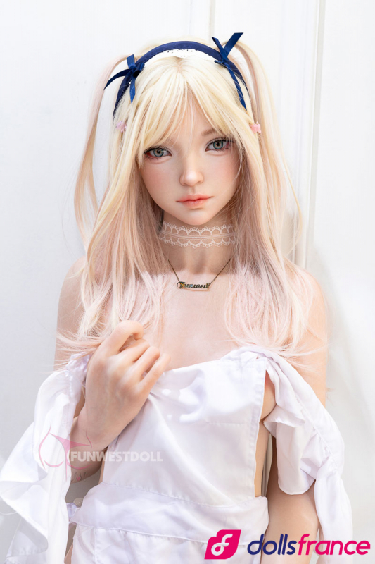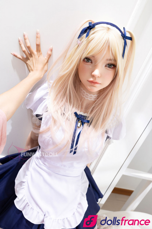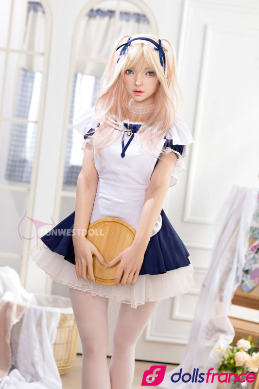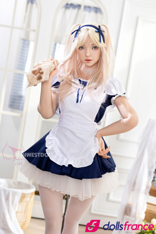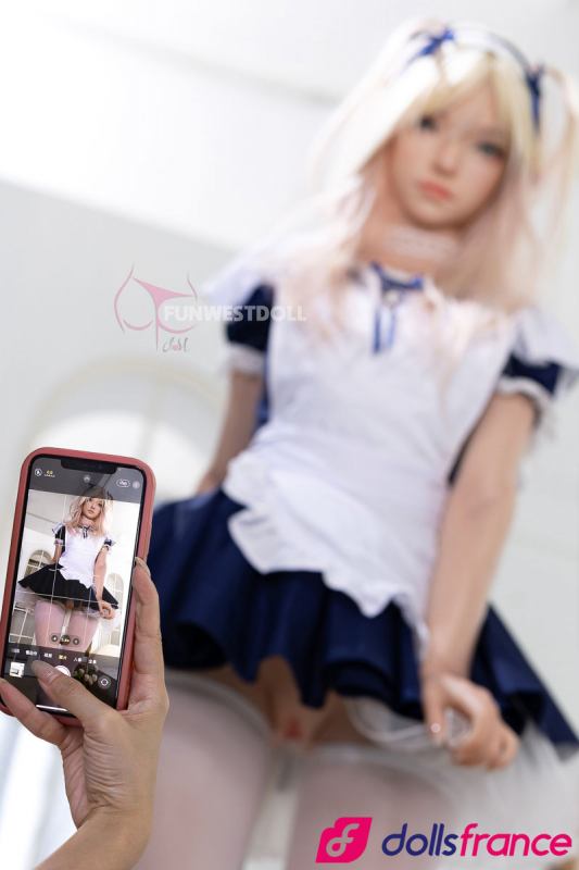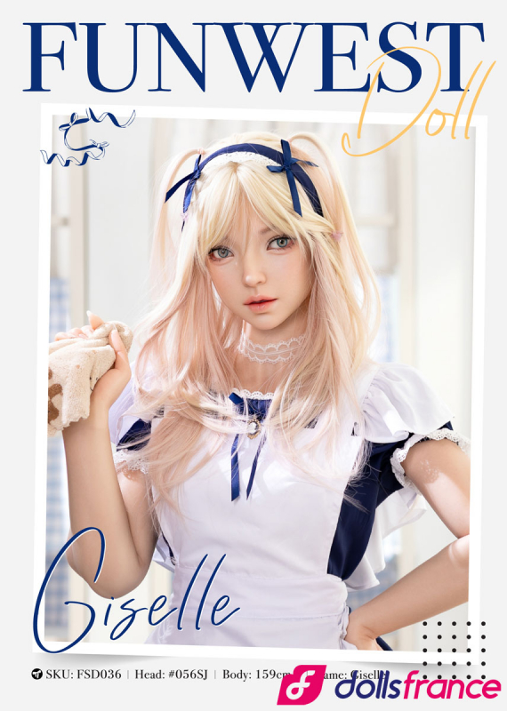 Giselle, la poupée d’amour en silicone soubrette coquine de la marque FunWestDoll, mesure 159 cm avec une poitrine taille A-cup. Elle dégage un charme doux et innocent, aux airs de jeune soubrette à la fois naïve et vulnérable. Ses cheveux blonds sont joliment ornés d’un nœud bleu assorti à sa minijupe bleue, tandis que ses collants blancs complètent sa tenue espiègle.