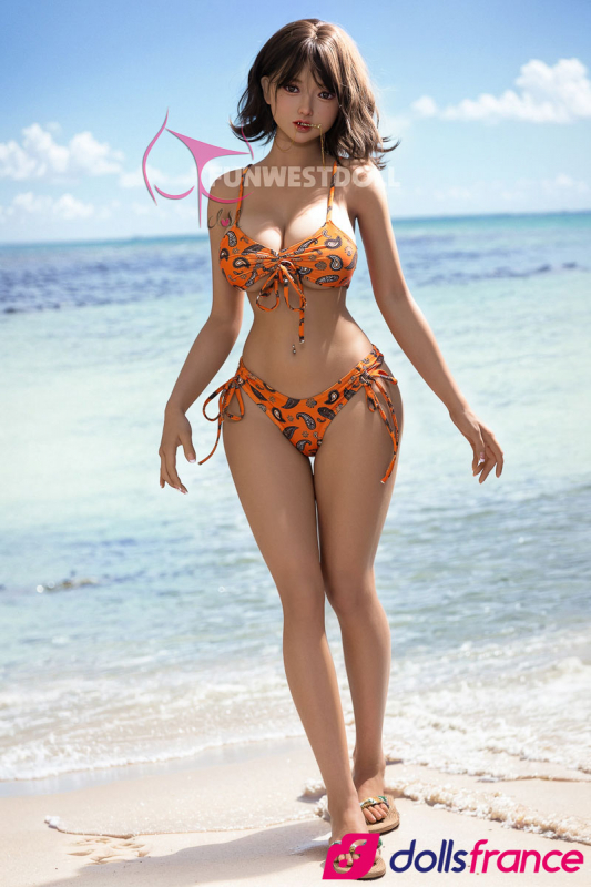 Sur la plage, Amy la sex doll asiate aime se dandiner avec sensualité sous le soleil, bronzer intégralement et pratiquer le naturisme pour exhiber ses courbes magnifiques. Son corps nu révèle une énorme paire de seins G-cup si volumineux qu’ils semblent prêts à exploser, captivant les regards par leur rondeur provocante et leur fermeté irrésistible.