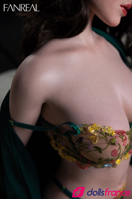 La poupée pour adultes Gina la doll distinguée de la marque FanReal mesure 155 cm et affiche une silhouette parfaite avec sa poitrine généreuse en bonnet F. Elle porte une somptueuse tenue verte en satin qui sublime son élégance, parfaitement assortie à ses sous-vêtements transparents à fleurs. Son porte-jarretelles, sa culotte et son soutien-gorge transparent ajoutent une touche de séduction raffinée.