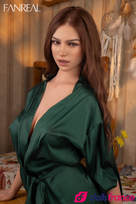 Ses gros seins de sexdoll F-cup dessinent des nibards massifs et fermes, au galbe prononcé et aux aréoles bien dessinées, qui se soulèvent naturellement sous le tissu soyeux vert émeraude ou se dévoilent entièrement dans les poses nues : une poitrine lourde et sexy qui domine visuellement son torse élancé.
