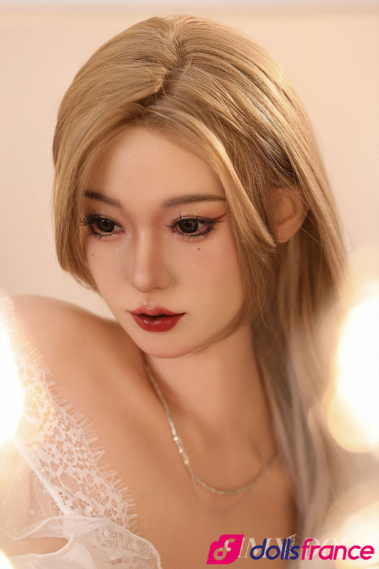 Cette poupée taille réelle asiatique arbore une longue chevelure blonde qui encadre un visage aux traits fins et expressifs, avec des yeux intenses et des lèvres pulpeuses teintées de rouge profond. Vêtue d'une nuisette légère en dentelle blanche, elle dégage une sensualité raffinée, accentuée par des bas transparents qui gainent ses jambes fuselées. Chaque détail, des ongles soignés aux courbes du dos, invite à l'exploration tactile.