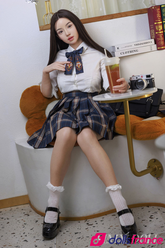 Sous la lumière tamisée d’une chambre aux teintes pastel, Meng Ting, la sexdoll Ultra Series 156B MMX, s’abandonne avec une grâce silencieuse. Sa silhouette élancée de 156 cm épouse son uniforme aux plis impeccables : chemise blanche entrouverte sur un bonnet E généreux, cravate marine ornée d’écusson, jupe plissée bleu nuit qui effleure à peine le haut des cuisses satinées. Ses longs cheveux encadrent un visage d’une douceur asiatique presque irréelle, lèvres entrouvertes comme une invitation muette.