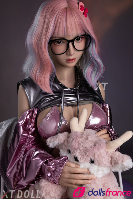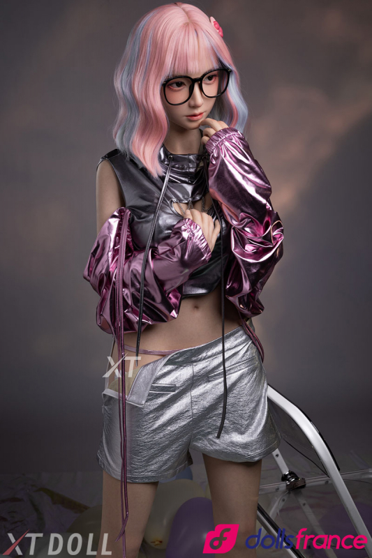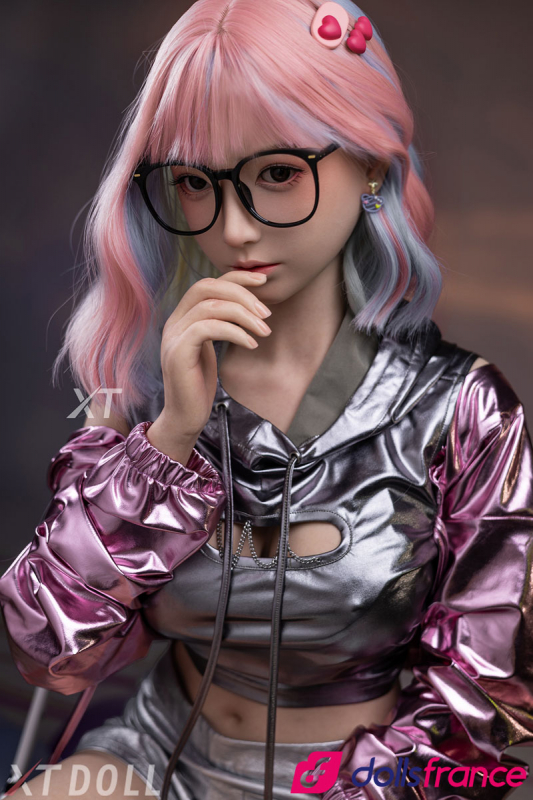 Cette sexdoll geek nympho porte des lunettes noires carrées qui soulignent son regard coquin et une coupe rose pastel aux reflets bleutés avec une petite barrette en forme de cœur rouge. Elle mélange style kawaii et provoc : un top en vinyle argenté ouvert sur sa poitrine, un mini-short métallisé rose et un string minuscule à chaîne dorée qui laisse tout voir quand elle se penche ou écarte les jambes.